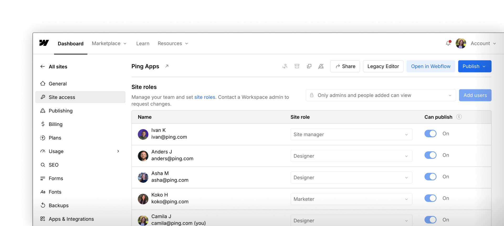 Webflow structures access around three core concepts, and understanding how they fit together is the first step to building a team that collaborates with clarity and confidence.