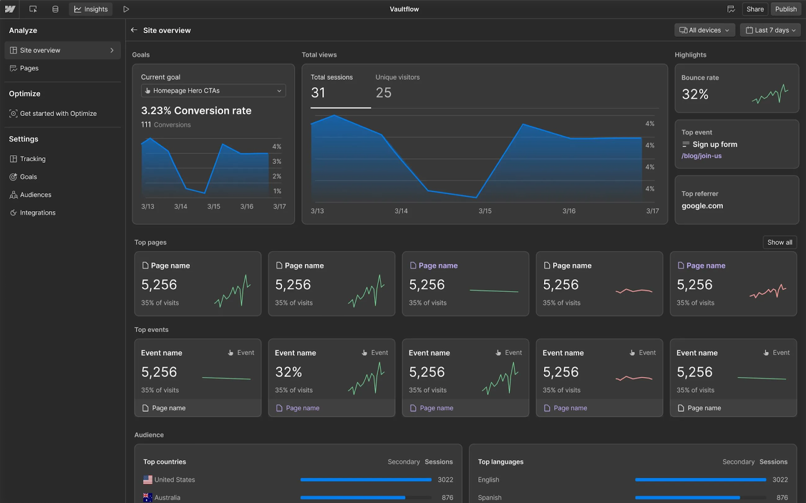 You can use Webflow Analyze for simple, built-in reporting, or tools like Google Analytics (GA4) for deep behavior insights.